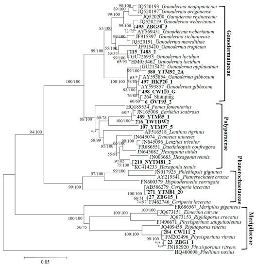 A neighbor-joining tree generated with ITS rDNA using MEGA 5.05 showing the phylogeny of Polyporales species detected in this study. The numbers in front of the slashes show bootstrap (1000 replications) values (%) of the branches, and the numbers behind the slashes show Bayesian posterior probability (%) generated with BEAST v1.5.4. Values that are less than 50% were substituted with asterisk marks. The best model for Bayesian analysis was HKY + I + G, selected using MrModeltest 2.2. Sequences in bold indicate fungal species obtained from this study.