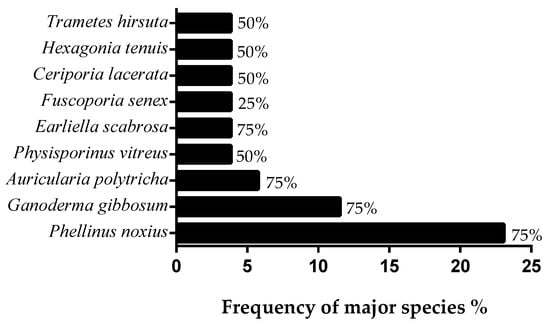 Nine fungal species, accounting for 60% of the wood-decay fungi detected in this study were considered as most abundant wood-decay fungi in the four parks investigated (Figure 4). Among the nine fungal species, P. noxius was the most abundant, followed by G. gibbosum and A. polytricha. These three species were also detected in most parks.