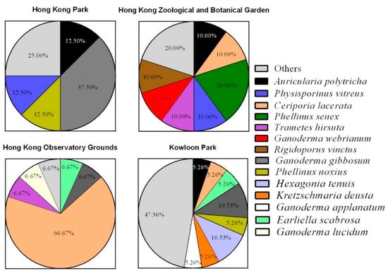 Therefore, this study was conducted to investigate the diversity, abundance, and distribution of wood-decay fungi associated with standing trees and stumps and to explore the potential driving factors of species-richness of wood-decay fungi in four different parks of Hong Kong.