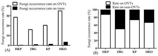 A comparison of wood-decay fungi occurrence rates on old trees and young trees. (A). A comparison of wood-decay fungi occurrence rate on OVTs and over all fungi occurrence rate. (B). A comparison of wood-decay fungi detected from OVTs and non-OVTs. (large trees in the case of HKO; HKP = Hong Kong Park, ZBG = Hong Kong Zoological and Botanical Garden; KP = Kowloon Park; HKO = Hong Kong Observatory Grounds).