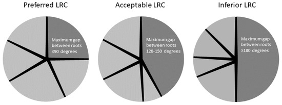 - Acceptable LRC: A larger gap in radial distribution of existing lateral roots (120–150 degrees) with potentially minor instability on one side.