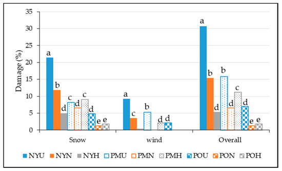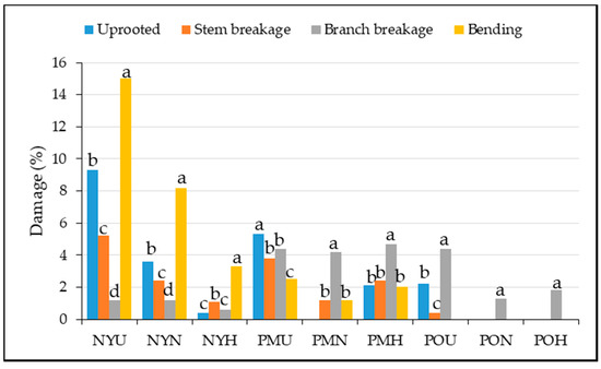 Percentage of damage types by snow and wind in the loblolly pine stand. Results of one-way ANOVA: F = 35.08, p < 0.01 in NYU; F = 33.50, p < 0.01 in NYN; F = 15.17, p < 0.05 in NYH; F = 16.29, p < 0.01 in PMU; F = 9.34, p < 0.05 in PMN; F = 11.60, p < 0.01 in PMH; F = 14.22, p < 0.01 in POU. Results with same letters are not significantly different (Duncan’s test, error rate of α = 0.05).