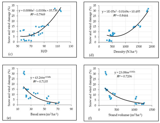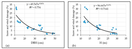 Our results indicated the snow and wind damages decreased by increasing tree DBH, height, stand basal area, and stand volume. These results supported previous studies showing that younger stands are likely to be damaged by snow due to slightly tapering stems [15,33]. According to this, the soil and root systems of trees are, of course, important for their stability [9,34], but their diameter, height, stem form, and relative crown length may also affect them [35].