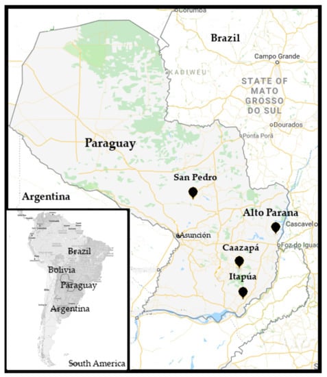 - MAG (Ministry of Agriculture and Livestock by Spanish acronym). Censo Agropecuario Nacional 2008; Ministerio de Agricultura y Ganaderia: San Lorenzo, Paraguay, 2009; Volume 1. [Google Scholar]
