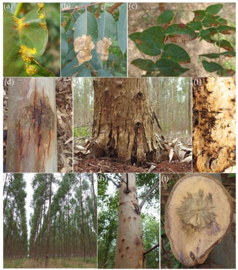 Symptoms of fungal diseases in Paraguayan eucalypts plantations. (a) Myrtle/Eucalypt rust symptoms on mature leaf, (b) Coniella leaf spot, (c) Calonectria blight, (d) Botryosphaeria canker, (e) Chrysoporthe canker, (f) Chrysoporthe sp. on eucalypt bark, (g, h) Teratosphaeria stem canker, (i) cross section showing a stem disease caused by unknown pathogen present in Eucalyptus urophylla x grandis.