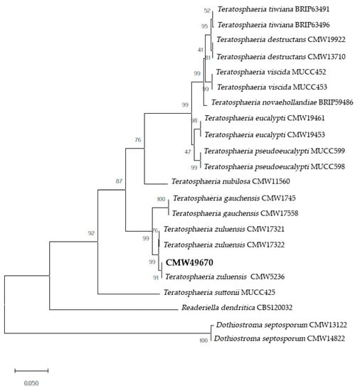 - Cortinas, M.-N.; Crous, P.W.; Wingfield, B.D.; Wingfield, M.J. Multi-gene phylogenies and phenotypic characters distinguish two species within the Colletogloeopsis zuluensis complex associated with Eucalyptus stem cankers. Stud. Mycol. 2006, 55, 133–146. [Google Scholar] [CrossRef]