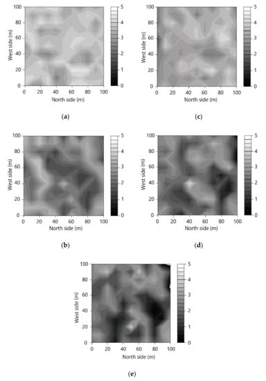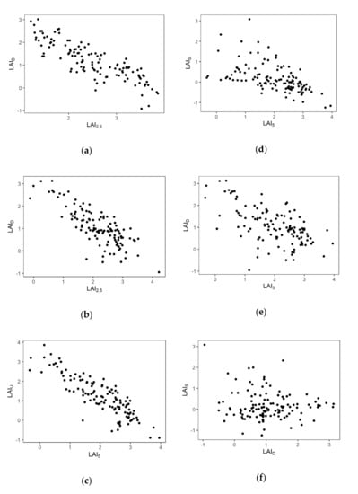 4.1. Spatial Distribution of LAI and Relationship among Layers