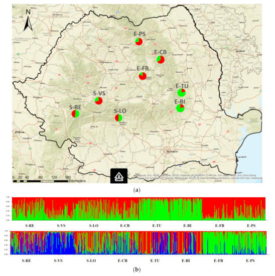 A two-cluster structure had the strongest statistical support in our sample (Figure 1b and Figure S1, Supplementary Materials). The highest value of Δk statistics (19.9) was obtained for k = 2 (Figure S1, Supplementary Materials). Two Scots pine populations located on the outward-oriented side of the Southeastern Carpathian arch (E-BI and E-TU) showed the highest membership values in one of the two genetic clusters (in green color in Figure 1). In contrast, the two peat bog populations (E-FB and E-PS) and one Southern Carpathian population located on rocky slopes (S-VS) showed a higher membership in the second genetic cluster (in red color in Figure 1). The other three populations were very admixed. However, when having three genetic clusters (k = 3), the two peat bog Eastern Carpathian populations split from the Southern Carpathian population (Figure 1b).