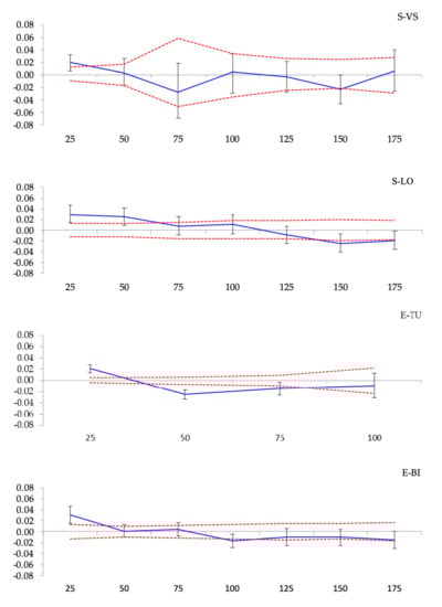 To assess patterns of SGS within populations, a spatial autocorrelation analysis was performed using the multivariate method by [45] implemented in GenAlEx v.6.5 software [34,35]. Geographical distances between individuals within each population were calculated according to latitude and longitude coordinates recorded with GPS Garmin 62s for every sample (except for population E-CB). The range of expected genetic similarity under random association was estimated using 999 random permutations; 95% confidence intervals around each value of r were estimated using 999 bootstraps. The r-values were plotted using the option of even distance classes, and the five classes were examined by distances of 25 m. The statistic Sp = −bF/(1 − F1), using SPAGeDi v.1.5 [46], where F1 is the mean Nason’s kinship coefficient [47] between all pairs of individuals in the first distance class (0–25 m), and bF (b-log) is the slope of the regression of kinship versus the log of distance [9], was calculated. The significance of the slope of the regression analysis was determined after 10,000 permutations. Their significance was tested with a one-tailed t-test using STATISTICA software v.10 [36].