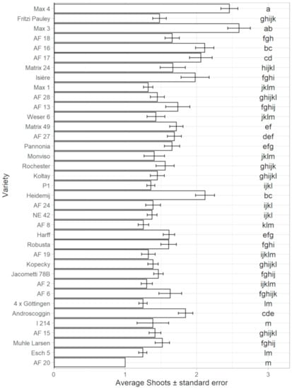Average (±standard error) number of shoots of the poplar varieties in the winter of 2018, six years after planting and three years after the first harvest. Statistical analysis was carried out using the non-parametric Kruskal–Wallis test (α = 0.05, n ∈ [17;95]) paired with Fisher’s least significant difference procedure to highlight statistically different varieties; the letters on the right-hand side of the figure represent the statistical groups to which each variety belongs.