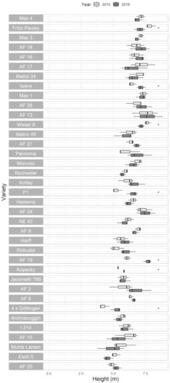 At the end of the first growing season, the 37 poplar varieties reached an average height of 1.60 m. The greatest plant heights were achieved by AF 17 with 2.35 m, followed by I 214 (2.20 m) and Max 4 (1.98 m). In contrast, Jacometti 78 B (1.12 m), Rochester (1.11 m) and AF 2 (1.09 m) showed only a weak height growth in the year of establishment. After three years, in 2015, a median height of 6.29 m was recorded for all poplar varieties. AF 13 (7.95 m), Weser 6 (7.76 m) and Fritzi Pauley (7.75 m) were the most successful ones in terms of height gain, while 4 × Göttingen (4.04 m), AF 20 (4.78 m) and Robusta (5.00 m) had achieved the lowest plant height after three growing seasons (Figure 2). In the second rotation period from 2015 to 2018, the average height of the poplar varieties only increased by 0.19 m to 6.48 m. Compared to the first rotation period, 20 varieties showed an increase in height growth at the end of the second rotation period, and 17 varieties a decrease. AF 19 had the greatest increase in height, which was 1.83 m higher than at the end of the first rotation period, followed by AF 13 and AF 24. The lowest plant height after two rotation periods was recorded for Esch 5 (4.49 m), Muhle Larsen (5.12 m) and AF 15 (5.34 m).