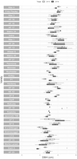 Diameter at breast height of the poplar varieties in the winters of 2015 and 2018. For each variety, the difference between the diameter in 2015 and in 2018 was analyzed using the non-parametric Kruskal–Wallis test (α = 0.05, n = 3). Statistically significant differences are marked with an asterisk.