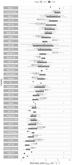 After the first rotation period, in 2015, Fritzi Pauley reached the highest yield with 14.6 tadm ha−1 y−1, followed by Weser 6 (14.3 tadm ha−1 y−1), Max 3 (12.4 tadm ha−1 y−1) and Max 4 (12.0 tadm ha−1 y−1) (Figure 4). Moderate yields between 6.8 and 6.9 tadm ha−1 y−1 were recorded for Pannonia, AF 27 and Matrix 49. AF 20 (2.4 tadm ha−1 y−1), 4 × Göttingen (2.8 tadm ha−1 y−1) and AF 19 (3.2 tadm ha−1 y−1) had the lowest yields. After the second rotation period, in 2018, the highest yield was found for Max 4 with 15.8 tadm ha−1 y−1. Fritzi Pauley (14.5 tadm ha−1 y−1) and Max 3 (13.3 tadm ha−1 y−1) reached only slightly lower yields. With 8.1 tadm ha−1 y−1, P1, Pannonia and Koltay showed moderate yields. The lowest yields were recorded for AF 20 (0.8 tadm ha−1 y−1), followed by Esch 5 (1.2 tadm ha−1 y−1) and AF 15 (2.5 tadm ha−1 y−1). Between the first and the second rotation periods, 19 varieties were able to increase their yield, whereas 18 varieties showed a yield reduction. The increases were greatest for AF 18 (4.8 tadm ha−1 y−1), AF 16 (4.1 tadm ha−1 y−1) and Max 4 (3.8 tadm ha−1 y−1). The greatest decreases were recorded for Weser 6 (−5.4 tadm ha−1 y−1), Max 1 (−4.1 tadm ha−1 y−1) and Esch 5 (−3.0 tadm ha−1 y−1).