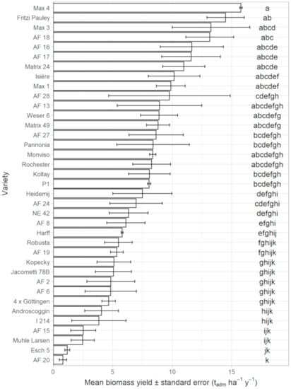 Average (±standard error) biomass yield of the poplar varieties in the winter of 2018, six years after planting and three years after the first harvest. Statistical analysis was carried out using the non-parametric Kruskal–Wallis test (α = 0.05, n ∈ [17;95]) paired with Fisher’s least significant difference procedure to highlight statistically different varieties; the letters on the right-hand side of the figure represent the statistical groups to which each variety belongs. All presented results are in order of the biomass yield presented in this figure.