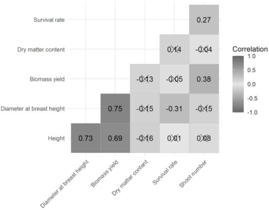 Slightly positive correlations between the survival rate and the number of resprouting shoots (0.27), as well as the number of resprouting shoots and the dry matter biomass yield (0.38), were calculated (Figure 6). Furthermore, a strong correlation between plant height and DBH (0.73) was found in this study. This is also affirmed by the close correlations between DBH and biomass yield (0.75), and between plant height and biomass yield (0.69) (Figure 6).