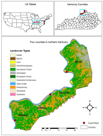 The study focused on four counties (Trimble, Gallatin, Carroll, and Boone) in northern Kentucky. This area is unique for its geographical location bordering northern and southern regions of the US. It is also representative of the Ohio River basin. There is a diverse land use with small, privately-owned, parcels of land. Further, there are three coal plants within the four-county area that provide opportunities to co-fire biomass with coal for energy generation without the need of significant capital investment for establishing new bioenergy facilities (Figure 1).