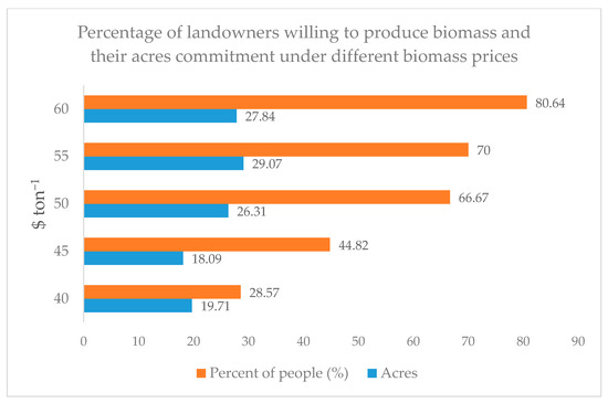 For landowners who were willing to produce and harvest biomass, we asked them to indicate what price they were willing to accept and the number of acres of land they were willing to commit. Figure 2 shows the percentage of landowners willing to accept five different prices and their average acreage commitment. For a biomass price of $40 ton−1, 28.57% indicated that they were willing to produce and the average amount of land available at this price was 19.71 acres. When the price was $60 ton−1, 80.64% were willing to produce/harvest and the average land available increased to 27.84 acres.