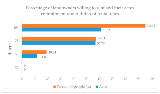 Landowners who were willing to rent their land for bioenergy production were asked to indicate the rental rate they were willing to accept. Figure 3 shows the percentage of landowners willing to rent and the acres they were willing to commit under four different rental rates. None of the respondents indicated that $25 acre−1 was an acceptable rental rate. However, when the rental rate increased to $100 acre−1, 95.23% indicated they were willing to rent an average of 62.22 acres.