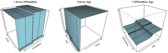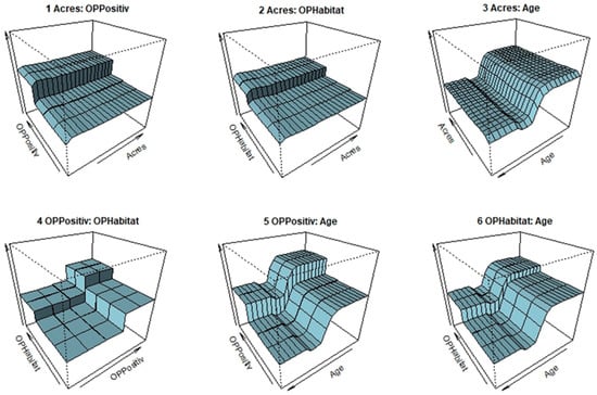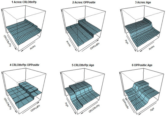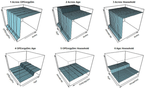 In addition to the effect of a single variable on the response, the partial dependence plots show important interactions between variables. For both the willingness to produce/harvest and willingness to rent models, three of the six most important pairwise interactions included the most influential predictors, age, and a positive perception about the idea of creating energy from trees (Figure 7 and Figure 8). Allowing interactions reinforced the effect that younger landowners (landowners in general) with large acres of land ownership and who had a positive perception about generating bioenergy and an understanding that establishing bioenergy crops can improve wildlife habitat were more willing to participate in bioenergy crop production. In the willingness to rent model, younger landowners who had small acres of existing land ownership showed interest in renting out their lands and those landowners were positive about creating energy from trees and were not concerned about having other people in their land.
