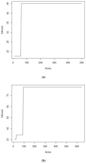 Partial dependence plots for acres variable for the two models; acres to produce (a) and acres to rent (b).