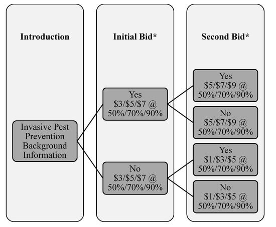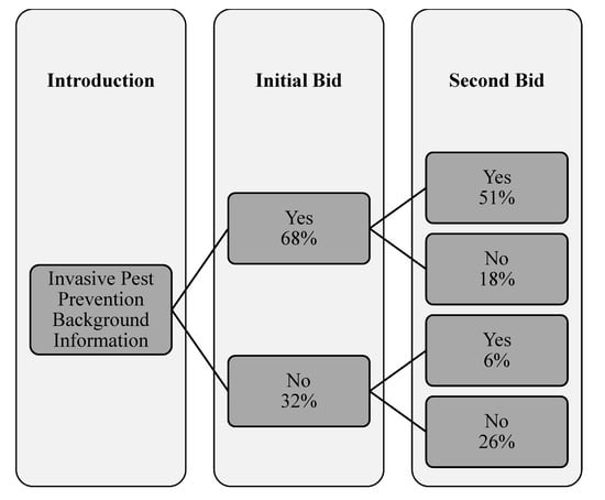 For the second part of the survey instrument, a double-bounded contingent valuation approach was used to also estimate the respondents’ WTP a utility fee in United States Dollars, $ hereafter, to implement a program to protect trees in urban and near-urban areas by preventing and monitoring the introduction of forest pests. This analytical approach has been used in a variety of other studies involving non-market valuation for issues such as safer drinking water [47,48], green energy [49,50,51], damage from oil spills [52], and forest resource restoration [53].