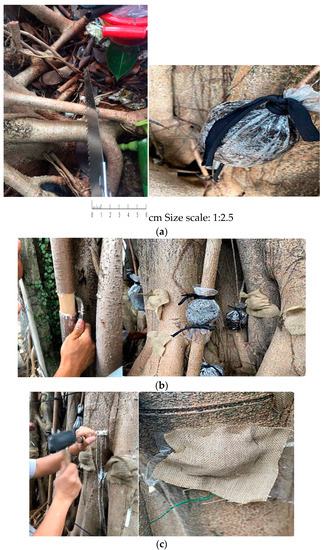 Figure 1. Wounding methods (WMs): (a) cutting off (CF), (b) girdling (GD), and (c) rectangular shape peeling (RP). (a) CF: cut off the aerial roots, (b) GD: girdle the aerial roots deep into the xylem, and (c) RP: incise a rectangular window on the surface of the prop roots of 4 × 2 cm deep into the xylem, then peel off the skin of the window.
