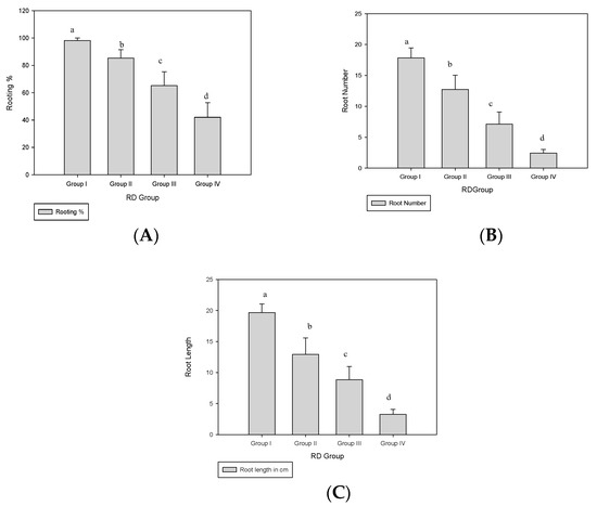 The rooting ability, including rooting%, root number in wounds, and mean root length in wounds, favored the smaller RD groups; RD I > RD II > RD III > RD IV.