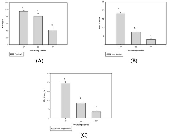 The average root number was 18.5 roots for CF, trailed by 7.4 roots for GD, and 2.9 roots for RP. There was significant variation among the three wounding methods in terms of the root number. CF had far more roots in wounds than GD, and GD had more roots in wounds than RP (Figure 3B).