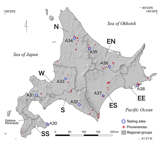 Abies sachalinensis is a major component of natural forests in Hokkaido, northern Japan. The geographical distribution of A. sachalinensis includes Sakhalin, the southern Kuril Islands, and Hokkaido, the northernmost island of the Japanese Archipelago [28]. As one of the most important commercial timber species in Hokkaido, the proportion of timber volume of artificial plantations is approximately 50% and the seedling stock is 25–30%. The breeding program for A. sachalinensis began in the 1950s in Hokkaido. During the program, a total of 782 “plus trees”, showing good performance in growth and stem straightness, were selected from natural and artificial forests throughout Hokkaido. The initial seed zones were determined in 1985 based on the results of common garden and provenance trials (e.g., [29]) and the local climate. According to the seed zones, breeding programs have been started to establish seed orchards in different regional zones. To improve timber production, these seed zones must be validated. Initial evaluation of seed zones was based on the results obtained from three provenance test sites [30]. For further improvement of future timber production, comprehensive assessment using a range-wide provenance test is necessary to validate the seed zones.