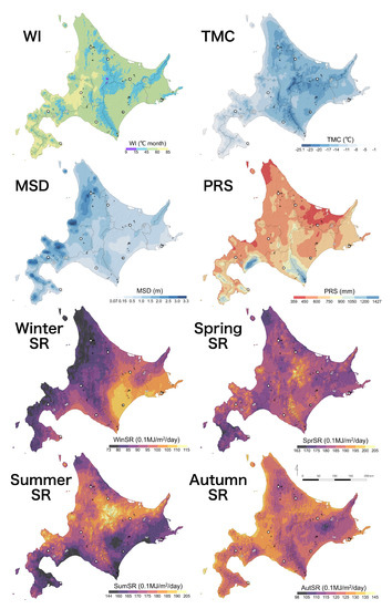 We used climatic data for grid cells from the Japan Meteorological Agency [39], which had a spatial resolution of 30″ N × 45″ E (approximately 1 km × 1 km). The following eight climatic variables, which were considered as important for the growth of A. sachalinensis according to previous studies [29,32], were calculated (Figure 2). The warmth index (WI) (C month) was defined as the annual sum of positive differences between the monthly mean temperature and +5 C [40], indicating an effective heat quantity for the growth of plants. The monthly mean daily minimum temperature of the coldest month (TMC) (C) provides a measure of extreme coldness. Precipitation during summer (PRS) (mm) is a sum of precipitation from May to September and represents the water supply during the growing season. The maximum snow depth (MSD) (m) is a measure of snow accumulation. Solar radiation in winter (October to April, WinSR), spring (May, SprSR), summer (June to August, SumSR), and autumn (September, AutSR) (0.1 MJ/m/day) are measures of energy distributions in each season. Spring, summer, autumn, and winter months for each variable were determined by variables of each month showing mutually positive relationships.