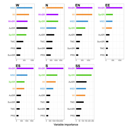 The MRF for the height growth of A. sachalinensis with climatic distances between seed provenances and testing sites showed the following coefficient of determinations (R)—0.32 for W, 0.36 for N, 0.31 for EN, 0.33 for EE, 0.38 for ES, 0.38 for S, and 0.45 for SS (Figure S1). These R values and Figure S1 show that the prediction accuracy of the MRF was not high; however, the overall trends in height growth were reproduced successfully. Variable importance analysis of the regional groups in the MRF showed that WinSR, WI, MSD, and SprSR had relatively important effects on the height growth of A. sachalinensis, whereas the order of variable importance differed among the regional groups (Figure 3). WinSR showed the highest importance in most regional groups, except in W and N. MSD showed the highest importance in the W region, which has the heaviest snowfall. In contrast, PRS had the lowest importance, except in the W region.
