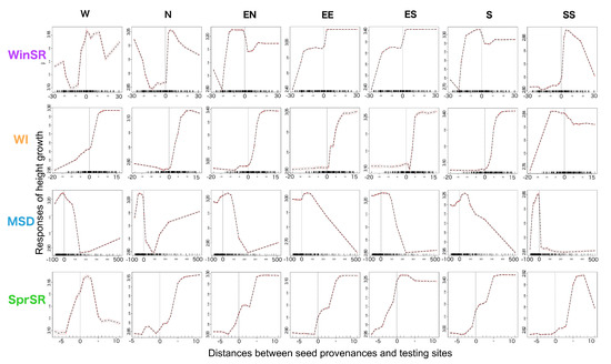 The MRF showed that WinSR, WI, MSD, and SprSR were important factors affecting the height growth of A. sachalinensis, although the order of importance differed among regional groups (Figure 3). The model also showed that responses of height growth to climatic variables differed among regional groups, which may reflect different selection regimes to local environments (Figure 4). Genetic differentiation along environmental gradients was circumstantial evidence of local adaptation to the respective environment [34].