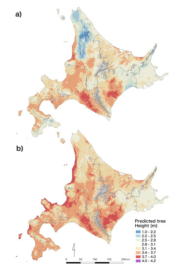 In contrast, PRS was not selected as an important factor in this study (Figure 3). However, PRS is considered as a critical factor determining the distribution of species in the genus Abies because Abies is generally less drought-resistant than other coniferous species are [53,54]. Our results suggest that the range of PRS in Hokkaido is sufficient for the height growth of A. sachalinensis in all regions.