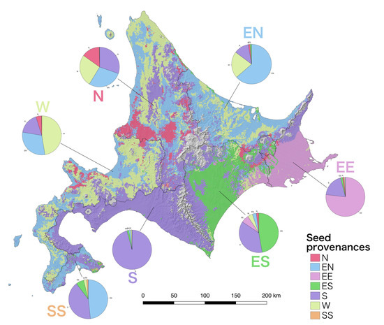 The different commercial seed zones for A. sachalinensis were recently updated by Nakada et al. [31], and five zones were recognized—the West, North, East, Eastern edge, and South. In this study, we evaluated seven regional groups—W, N, EN, EE, ES, S, and SS groups (Table S1, Figure 1). In the East zone, two sub-zones were suggested based on the climatic difference between the Sea of Okhotsk and the Pacific Ocean sides [32]. We adopted this suggestion and subdivided the East zone into the EN and ES groups. Moreover, the Oshima Peninsula in the West and South zones have a warmer climate and different vegetation from other parts of Hokkaido in which wild A. sachalinensis is scarcely distributed [33]. Additionally, our previous study revealed that the southern populations showed low genetic diversity and were genetically differentiated from other populations [34]. Thus, we discriminated SS as a regional group referring to the southern part of the South seed zone.