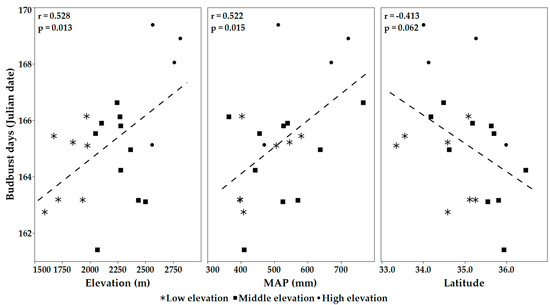 Correlation analysis revealed some interesting relationships between mean provenance budburst date in the field planting and environmental and geographical characteristics (Table 2). Specifically, budburst date had a moderately positive correlation with elevation (r = 0.528, p = 0.013) and MAP (r = 0.522, p = 0.015) and a moderately negative trend with latitude (r = −0.413, p = 0.062) (Figure 2).