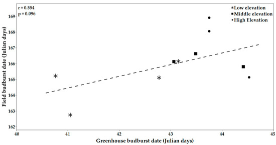 A moderate, positive trend (r = 0.554, p = 0.096; Figure 3) was found between budburst dates measured in the field planting and those measured in the greenhouse planting for the same 10 provenances (Table 1). Budburst occurred much earlier in the greenhouse (Julian days 41 to 45), which was warmed up in mid-January to promote early growth, compared with the field, where budburst occurred in late June (Julian days 163 to 169). In addition, for the same 10 provenances, the budburst range of about 4 days in the greenhouse was less than the range of about 6 days in the field.