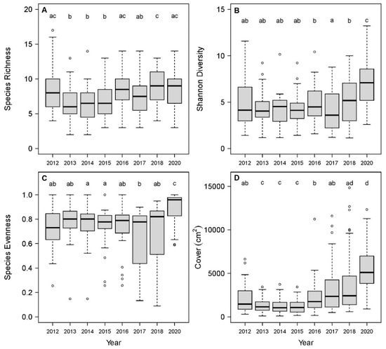 Herbaceous layer species richness (A), Shannon diversity (B), evenness (C), and cover (D) from 2012 to 2018 and 2020 in Drew Woods State Nature Preserve (DWSNP) (plots were not sampled in 2019). Shannon diversity values are effective numbers of species. Letters indicate significant differences from post-hoc tests (pairwise paired t-tests) that followed repeated measures ANOVA.