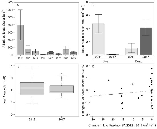 Summary of emerald ash borer (Agrilus planipennis) and Alliaria petiolata perturbances in DWSNP. (A) Changes in mean cover of A. petiolata through time in response to removal efforts. (B) Mean basal area (m2 ha−1) of living and dead ash (Fraxinus spp.) in 2011 and 2017. (C) Leaf Area Index (LAI) measured in 2012 and 2017. (D) Comparison of change in leaf area index (LAI) and change in living Fraxinus spp. basal area (BA) from 2012 to 2017.
