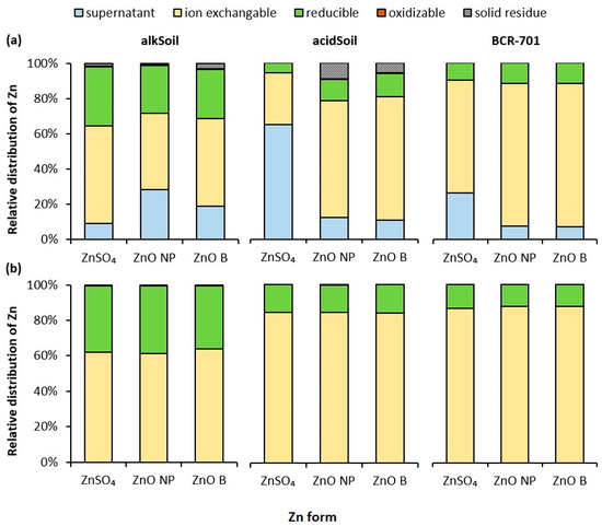 Relative contents of Zn in ion-exchangeable, reducible and oxidizable fractions were very similar for all three Zn forms (Figure 1b and Supplementary Material Tables S4–S7). Only ZnO B in alkSoil had a relatively higher content of Zn in the ion-exchangeable fraction, by ca. 2% compared to both ZnO NP and ZnSO4. Particulate and ionic Zn have different retentions in the same soil. Hence, depending on whether Zn is in the particulate form or ionic, the dissolved form affects the quantitative nature of the distribution between solids and liquid in alkSoil and acidSoil as defined under the operational conditions of the experiment (Figure 1a). However, the general affinity towards the three studied soil fractions—ion-exchangeable, reducible and oxidizable—was very similar for all three Zn forms (Figure 1b and Table S7).