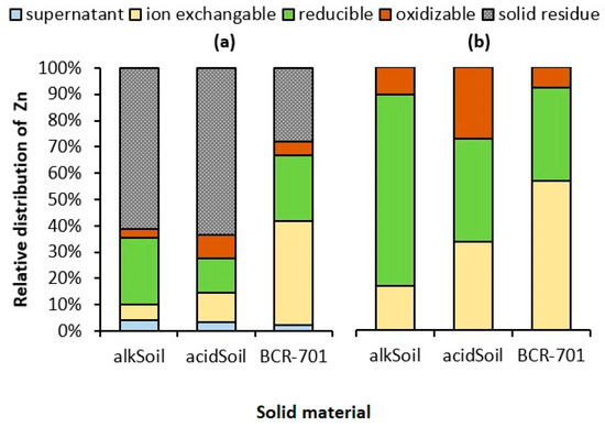 Control experiments with no addition of Zn and extraction validation with certified reference material BCR-701 were also undertaken. The distribution of Zn in the entire experimental setup is highlighted in Figure 2 (and in Supplementary Material Table S2). The artificial rainwater extracted between 2.2% and 4.3% of the natural Zn found in the solid materials. The first step of the BCR extraction procedure—the ion-exchangeable fraction—contained different relative amounts of natural Zn bound in the solid materials—5.9, 11.3, and 39.7% for alkSoil, acidSoil and BCR-701, respectively. The reducible fraction amounted to 25.3, 13.0, and 24.8% of Zn bound in the solid materials alkSoil, acidSoil, and BCR-701, respectively; and 3.6, 9.1, and 5.4% of Zn was extracted from the oxidizable fraction of alkSoil, acidSoil, and BCR-701, respectively. For solid residue, a relative amount of 61.0, 63.3, and 28.0% Zn bound in the solid material alkSoil, acidSoil, and BCR-701 was found, respectively. The two soils contain relatively more Zn in less accessible, reducible and oxidizable fractions and in the solid residue than BCR-701. The total concentration of Zn in the two soils is lower than in BCR-701 (see Supplementary Material Table S2). The concentrations of Zn in both alkSoil and acidSoil were below the threshold of amendment by Zn, according to the decree of the Slovak Ministry of Agriculture [47], and they are typical for the region where the soil samples were collected [48]. The concentrations in both soils are above the average value for non-contaminated soils, which is around 64 mg kg−1 Zn [7].