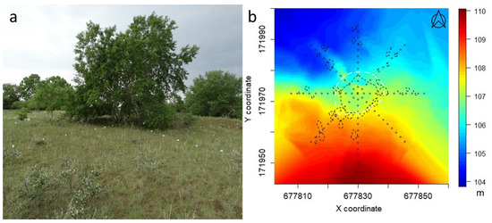 Study site (a) and relief map with the indication of the grove (b). Coordinates refer to the Hungarian Unified National Projection System. There were 89 measurement positions (4 × 22 positions in the four transects and the centre as position 12 in all transects). White dashed line: visual tree edge. Black dashed lines: the position and extent of individual shrubs and poplar sprouts.