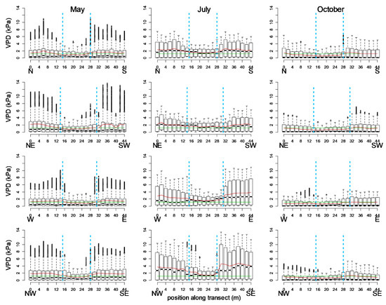 The distribution of the VPD values originating from 89 locations (4 × 22 positions in the four transects and the centre position) representing three seasons is illustrated by boxplots (Figure 2). The visually identified edges of the grove are also marked in the figures to identify the below-canopy area, the edges, and the open areas. In the figures, the left sides represent the colder sides and the right sides, the warmer ones, as determined by the irradiation and shadow patterns (cardinal directions).