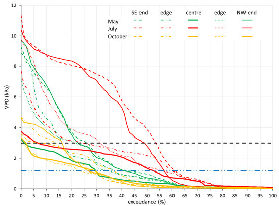 The durations of the values being over the thresholds provide important information about the spatio-temporal pattern of the VPD. Figure 3 compares the DCs of the two ends, the edges, and the centre of the SE–NW (Southeast–Northwest) transect for the three measurement periods. Among the four transects, the difference in the effect of the exposure was the most pronounced in this one, but the behaviour of the other three transects was similar. In terms of the stress threshold (1.2 kPa) exceedance rates, the summer patterns differed significantly from the spring and autumn. The exceedance rates ranged from 29% to 41% in May, from 52% to 60% in July, and from 22% to 36% in October. In terms of VPD distribution, however, further groupings emerged. The distributions of the values measured in the middle of the grove showed relatively small seasonal differences, with longer but not stronger exceedance rates measured during the summer. The exceedance rates were 29% in May, 52% in July, and 29% in October. Although the exceedance rate for 1.2 kPa showed a small variation in each measurement period, the intensity of the exceedance already differed significantly between the individual measurement positions. The duration curves of both the end-of-transect and edge measurement series ran close to each other in each period, but their distributions differed significantly. The maxima of the end-of-transect and edge series for the spring and summer measurements were in the range of 8–11 kPa, and the others were in the range of 3–5 kPa. The spring and summer measurement series ran close together, except for the summer end-of-transect (open grassland) measurement series (Figure 3). The VPDs of the latter two series of measurements, on the other hand, were well above the others, with a more-than-45% exceedance rate with respect to 3.0 kPa, while the rates for the others were below 25%. Above 2.5 kPa, the variability of the exceedance rates began to increase in all transects; therefore, we examined the exceedance at 3.0 kPa as well (Figure 3 and Figure 4b). The exceedance rates with respect to 3.0 kPa ranged from 1% to 25% in May, from 6% to 53% in July, and from 1% to 16% in October.