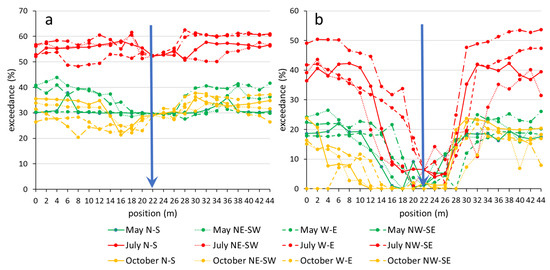 The exceedance rate with respect to the threshold of 1.2 kPa calculated from the VPD DCs also showed seasonal variability (Figure 4a). In each of the three measurement periods, at least 20% of the values were above the threshold. In the spring and autumn measurements, the exceedance rate was 20–45%, while in the summer period, it was 48–62%. Spring and autumn did not differ significantly from each other. The below-canopy exceedance rate was balanced and tended to be low, but the exceedance rate varied more across open areas. We also found differences in the VPD exceedance rate between the opposite ends of the transects. Choosing 3.0 kPa as the threshold value for the exceedance rate, the curves show a stronger difference between the areas in the opposite edges of the grove (Figure 4b). On sunny days, on the colder side, the lower values were even more pronounced when the Sun was at a lower altitude (October) at noon, with, sometimes, a 0–10% duration of values being above 3.0 kPa, as opposed to a 25–30% duration on the warmer side (Figure 5).