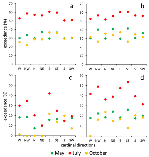 There were no remarkable differences among (all of) the edges during the spring measurements. In the case of the exceedance rate for the VPD values with respect to 1.2 kPa (Figure 5a,b), in the edges, the highest values always occurred on the eastern and south-eastern side, as well as in the grassland end positions, except for in October. In the edges, an increasing tendency could be observed from west to south-east, followed by a remarkable decreasing trend from south to west, although these trends did not appear in the case of grassland end positions. The values in the grassland varied during the three measurement periods. However, in the case of the exceedance rate of the VPD values with respect to 3.0 kPa (Figure 5c,d), the tendency was quite different in the edges. In the NW (Northwest), N (North), and NE (Northeast) edges, the exceedance rate was 0% with respect to 3.0 kPa. This tendency was also observed in May and July, but the fall was not as strong as in the October data.