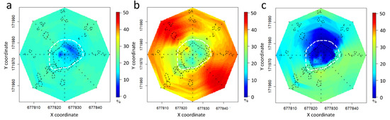 Spatial plots of exceedance rates (%) for VPD values with respect to 3.0 kPa from 24-h period of three measurement periods (coordinates refer to the Hungarian Unified National Projection System (m)); (a): May, (b): July, and (c): October. White dashed line: visual tree edge. Black dashed lines: the position and extent of individual shrubs and poplar sprouts.