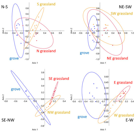 The ordinations also showed the different behaviour of the open areas of the SE–NW and E–W transects. During July, the open areas of these two transects were clearly distinct from each other, in contrast to the other two transects, where the confidence ellipses largely overlapped. The below-canopy positions were separated only in the SE–NW and E–W transects, while no outstanding differences were observed in the microclimatic conditions of the two other transects (Figure 7).