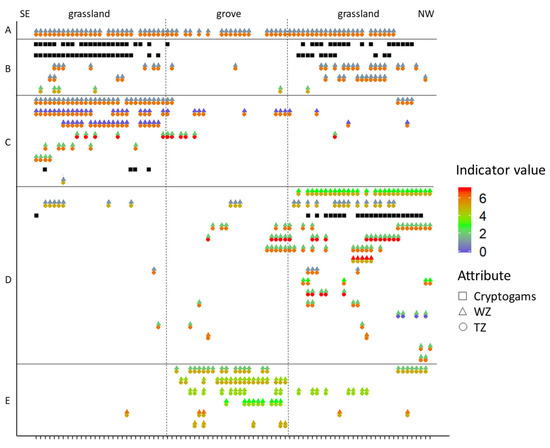 Distribution of the species along the SE–NW (Southeast–Northwest) transect in July 2018, together with the Zólyomi ecological indicator values, which quantify the temperature (TZ) and moisture (WZ) optimums for the plant species. Horizontal bars indicate coexisting species groups: (A) ubiquitous species; (B) species occurring in the grassland; (C) species occurring on the south-eastern side of the grassland; (D) species occurring on the north-western side of the grassland; (E) species occurring in the grove. List of species is shown in Table 1.