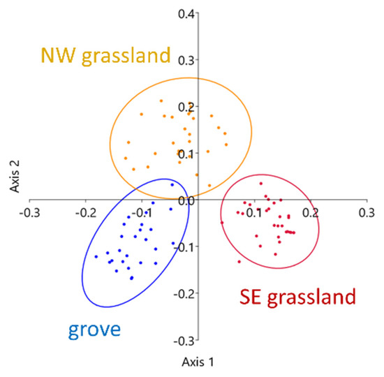 The ordination of the microcoenological data shows a clear difference between the three vegetation patches (Figure 9). The two grassland sides were notably separated from each other, and the grove just slightly overlapped with the NW grassland area. This slight overlap also applied to the VPD distribution (Figure 7, lower-left panel), indicating a more gradual transition toward the grove. The SE grassland side separated from the grove, similarly to the vegetation data, and the small overlap between the two grassland sides referred to the microclimatic similarities at the transect ends, which could also be observed in Figure 8. However, the two grassland sides showed remarkable microcoenological differences, and this difference was also manifested in the microclimatic conditions.