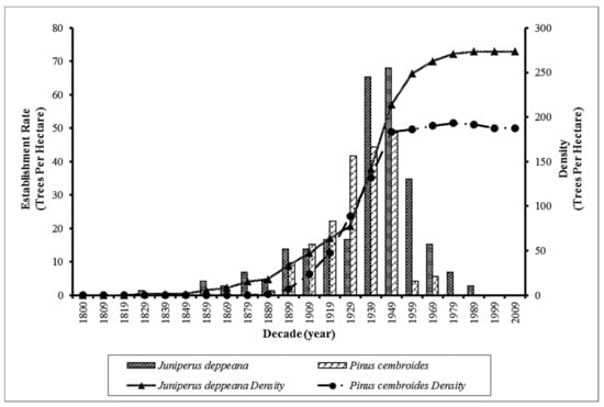 Greater recruitment rates and density estimates of alligator juniper between 1890 and 2005 could be explained by the same factors potentially responsible for the establishment of junipers in canopy interspaces and open areas [38,39,40].